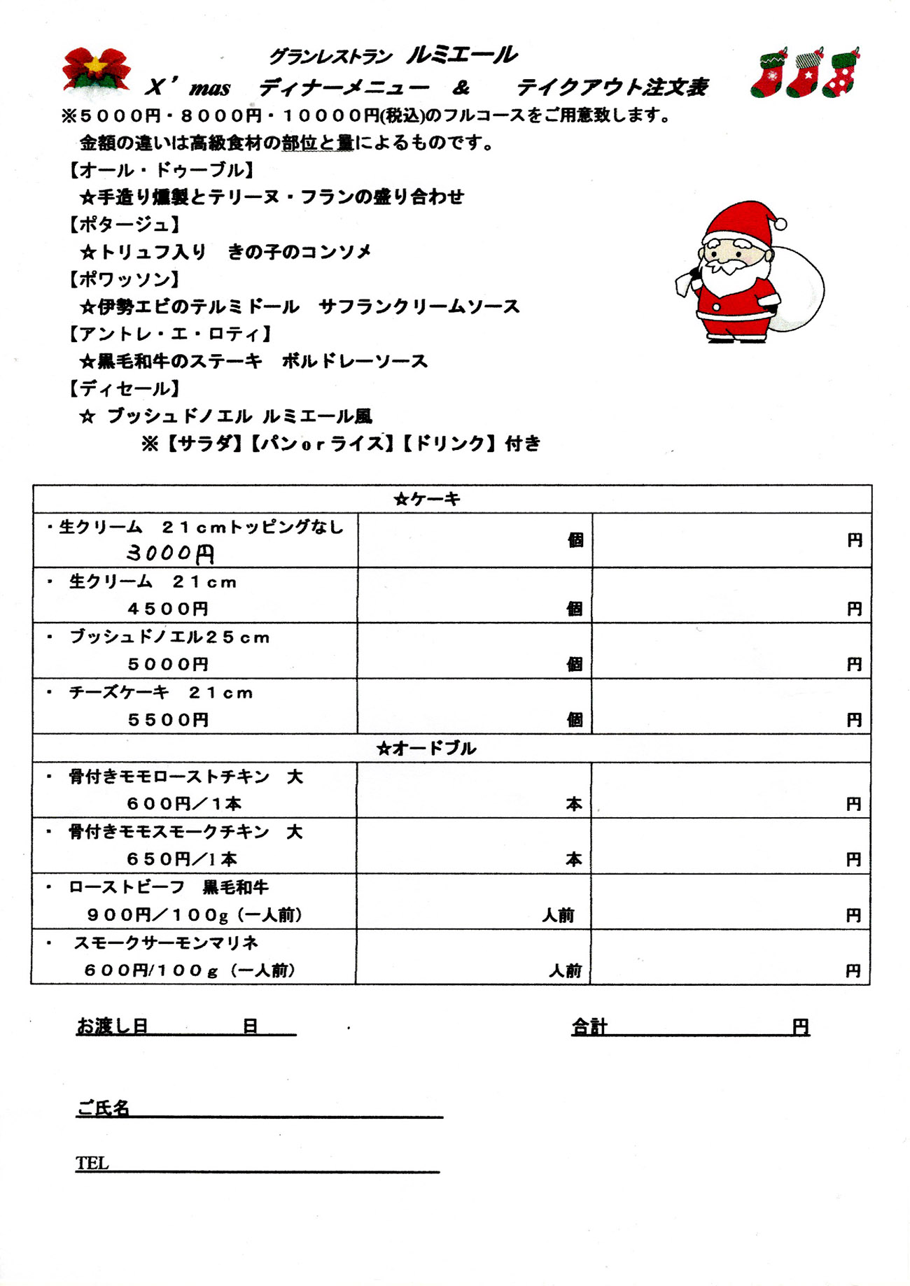 ※X'masケーキ、オードブルのご用命は、下記の注文表をプリントアウトし、ご希望の個数を書き入れて12月7日(日)までに店頭にお持ちいただくか、FAX(0551-45-7444)にてお送りくださいませ。